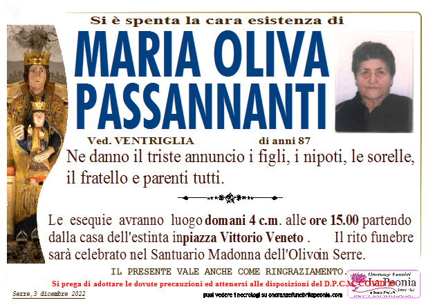 Si è spenta la cara esistenza di MARIA OLIVA PASSANNANTI. Il rito funebre sarà celebrato domani 4 Dicembre alle ore 15,00 nel Santuario Madonna dell’Olivo in SERRE Pubblicato damartinofunicelli3 dicembre 2022Pubblicato in: Senza categoria Manifesto consultabile su Condividi: Condividi su Facebook (Si apre in una nuova finestra) Facebook Correlati